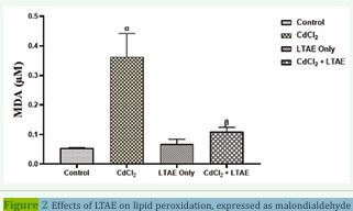 Figure 2 Effects of LTAE on lipid peroxidation, expressed as malondialdehyde (MDA). All data were estimated with the help of one-way ANOVA trailed by Tukey’s multiple comparisons tests. Data were expressed as mean ± S.E.M (n =5). α: significant change with respect to control; β: significant change with respect to CdCl2. Value of p < 0.05 was considered significant.