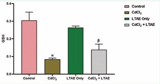 Figure 3 Effect of LTAE on glutathione levels in cadmium-induced neurotoxicity in rat brain across groups. All data were estimated with the help of one-way ANOVA trailed by Tukey’s multiple comparisons tests. Data were expressed as Mean ± S.E.M (n =5). α: significant change with respect to control; β: significant change with respect to CdCl2 . Value of p < 0.05 was considered significant.