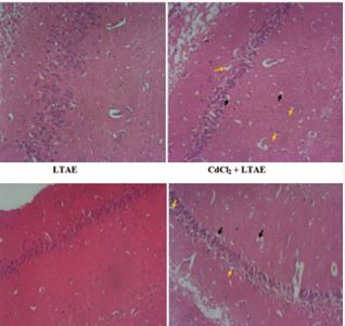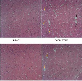 Plate 1 Representative photomicrographs of Haematoxylin and Eosin staining of the cerebral cortex of Wistar rats, magx100. The cerebral cortex of the control group presents normal neuronal morphology. In contrast, the cadmium group (CdCl2) was characterized by various degenerative changes with pyknotic nuclei (yellow arrows) and neuronal vacuolation (black arrows). LTAE alone treated group with well-organized neuronal cells. CdCl2+LTAE treated group with reduced pyknotic cells (yellow arrows) and absent of neuronal vacuolation comparable to the control. (CdCl2= Cadmium chloride; LTAE= Launaea taraxacifolia aqueous extract).