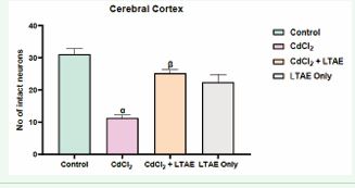 Figure 4 Morphometric assessment of intact neurons in the cerebral cortex of rat brain across groups. All data were estimated with the help of one-way ANOVA trailed by Tukey’s multiple comparisons tests. Data were expressed as Mean ± S.E.M. α: significant change with respect to control; β: significant change with respect to CdCl2. Value of p < 0.05 was considered significant.