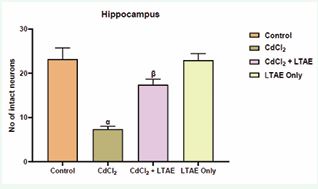 One way ANOVA test [Figure 4 and 5] shows a significant decrease in the neuronal population of cells in the animal group administered with CdCl2 alone. But with a co-administration of CdCl2 and LTAE, there was a significant increase in the number of neuronal cells compared with neuronal counts from cadmium treated group. Maximal neuronal cell population was seen in the control group. This implied that CdCl2 induced neuronal cell degeneration while LTAE restored and increased the populations of neuronal cells.