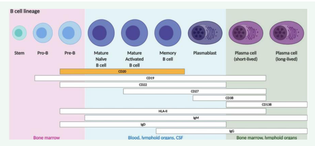 B cell development: Upon differentiation into plasmablasts, B cells begin to downregulate the expression of CD20, which is not expressed by plasma cells [Figure 1].