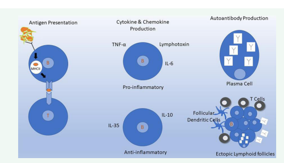 Initially, B-cell depletion both in the periphery and in the CNS was expected to exert its effect by diminishing the production of autoantibodies. However, the rapid onset of the profound effects of CD20 B cell-targeted therapies has prompted a reevaluation of the humoral immune response in MS. The concept holds that clinical benefit preceded humoral change/autoantibody synthesis. B cells play key roles in mediating disease activity and pro-inflammatory pathogenicity such as antigen presentation, cytokine production and antibody production by CNS-infiltrating B cells, and finally to a formation of ectopic lymphoid organs in the CNS [1,3,4,7].