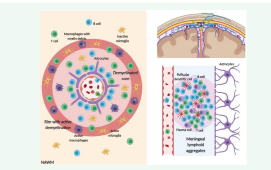 Formation of ectopic lymphoid follicles (ELFs) or tertiary lymphoid organs: B cells that have been attracted to the brain of MS patients, with the appropriate help from T cells, can proliferate, aggregate, and generate meningeal inflammation and eventually ectopic immunocompetent germinal center like structures, called also tertiary lymphoid organs, which are associated with more severe cortical pathology and more aggressive disease course. These B cell-rich ectopic lymphoid structures, which were described in secondary-progressive (SP) MS, RRMS, and active primary-progressive MS (PPMS), can serve as a reservoir of memory-B cells and autoreactive plasmablasts and plasma cells, perpetuating autoimmune disease. In addition, they can secrete soluble factors that were shown to be cytotoxic to both oligodendrocytes and neurons. B cells residing in ELFs appear relatively protected from anti-B cell therapy: this may in part be due to paracrine secretion of BAFF. In MS, this is further compounded by a relative lack of drug access to the CNS [6,7].