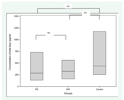 Figure 1: Data are expressed in median (25–75 IQR). Total salivary alpha synuclein measured in subjects with Drug Induced Parkinsonism (DIP), with Parkinson’s Disease (PD) and controls.