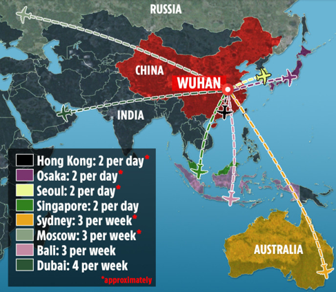 Figure 1 Coronavirus spread. Flights from deadly epicenter of Virus, Wuhan, could help byg reach other countries. (Source: The U.S. Sun, updated: 22 January 2020, 12:51 GMT).