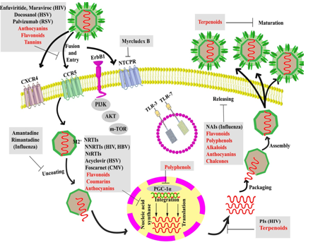 Figure 5 Targeting host proteins and several steps of the viral life cycle by current therapeutic and alternative natural products (in red). HIV, human immunodeficiency viruses; RSV, respiratory syncytial virus; HBV, hepatitis B virus; HSV-1/2, herpes simplex virus-1/2, NtRTIs, nucleotide reverse transcriptase inhibitors; NRTIs, nucleoside reverse transcriptase inhibitors; and NNRTIs, non-nucleoside reverse transcriptase inhibitors; NAIs, neuraminidase inhibitors; PGC-1α, peroxisome proliferator-activated receptor gamma coactivator 1-alpha [81].