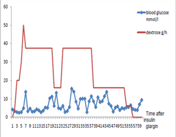 We report a 49-year-old, non-diabetic, 100-kg male, suffering from behavioral disorder without treatment who invokes emergencies 3 hours after injecting his mother’s insulin glargine (lantus®) in a suicide attempt. He injected 500 units in different sites: left arm, both thighs. The initial clinical examination revealed an asymptomatic patient with a blood glucose finger of 90 mg/dl. The laboratory tests showed hypokalemia with serum potassium 2.8 meq/l (normal: 3.5-4.8 meq/l), sodium 143 meq/l, glucose 4.2 mmol/l, urea 3.2 mmol/l and creatinine 56 μmol/l. His electrocardiogram was normal. A continuous infusion of 5% glucose started at a rate of 100 ml/h (i.e. 5g/h). Six hours after injection, the patient presented hypoglycemia (50 mg/dl) without any clinical manifestations. He was then transferred to intensive care unit. The blood glucose level was monitored hourly with glucometer (Figure 1),