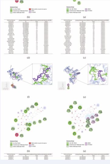 Figure 1 PPI showed the better docking scores by computer-based virtual screening targeting the dual targets ZBP1 and ADAR1 using the AutoDock tool. (a) and (b) displayed the scoring results for each small molecule from traditional Chinese medicines. (c) and (d) presented the three-dimensional docking images of PPI with ADAR1 and ZBP1, respectively. (e) and (f) illustrated the binding sites of PPI with ADAR1 and ZBP1 proteins, respectively.