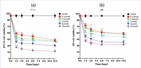 Figure 2 PPI inhibited the activity of bladder cancer cells in a time- and concentration-dependent manner. (a) The effect of PPI on the viability of RT112 cells. (b) The effect of PPI on the viability of J82 cells. Asterisks (*) denote statistical significance between the control group and the drug-treated group (*: p<0.05; **: p<0.01; ***: p<0.001).