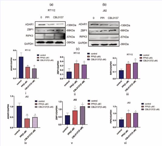 Figure 3 PPI inhibited the expression of ADAR1 and increased the expression levels of ZBP1 and RIPK3 proteins. a, b, and c showed the protein interference levels of PPI on ADAR1, ZBP1, and RIPK3, respectively, in bladder cancer cells RT112 and J82. Asterisks (*) indicate statistical significance between the control group and the drug-treated group (*: p<0.05, **: p<0.01).
