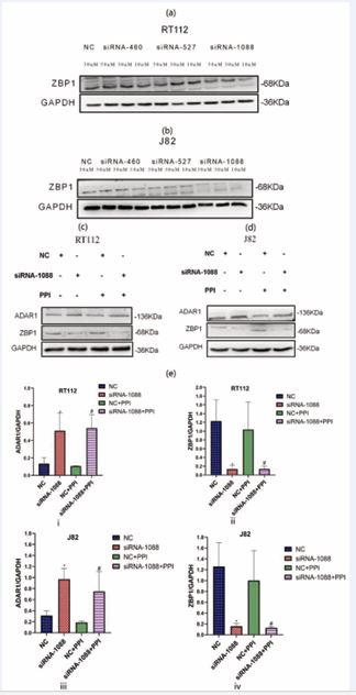 To verify whether PPI inhibits the proliferation of bladder cancer cells by inhibiting ADAR1 protein and increasing ZBP1 protein levels, this study conducted experiments to knock down the ZBP1 gene and overexpress the ADAR1 gene in bladder cancer cells. As shown in Figures 4a and 4b, the siRNA ZBP1 1088 exhibited better knockdown efficiency with increasing intervention concentrations after treating RT112 and J82 cells with siRNA ZBP1, and thus it was selected for further experiments. Figures 4c and 4d demonstrated that PPI was unable to suppress the protein level of ADAR1 in RT112 and J82 cells where the ZBP1 gene was knocked down.