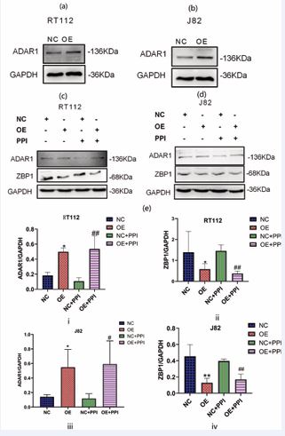 Figure 5 PPI failed to increase the protein level of ZBP1 after overexpressing the ADAR1 in RT112 and J82 cells. Western Blotting validation results following the overexpression of ADAR1 in RT112 and J82 cells (a, b). (c, d, e) depicted the protein levels of ADAR1 and ZBP1 following PPI treatment in RT112 and J82 cells that overexpress ADAR1. Asterisks (*) signify statistical significance between the negative control (NC) group and the overexpression (OE) ADAR1 group (*: p<0.05); the hash (#) indicates statistical significance when comparing the NC + PPI group to the OE ADAR1 + PPI group?#?P<0.05, ##?P<0.01.