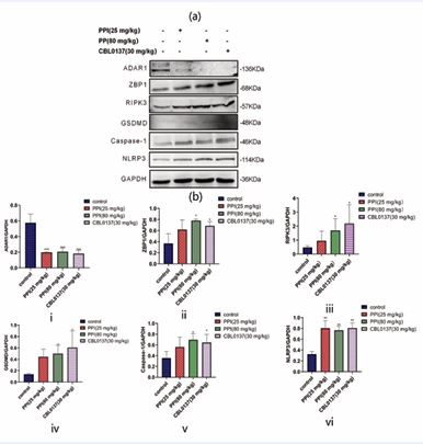Figure 7 PPI suppressed ADAR1 protein expression and elevated the levels of ZBP1, RIPK3, NLRP3, Caspase-1, and GSDMD. Protein expression levels in bladder cancer mice (a,b). An asterisk (*) denotes a statistically significant difference between the control group and the drug administered group (*: p<0.05, **: p<0.01).