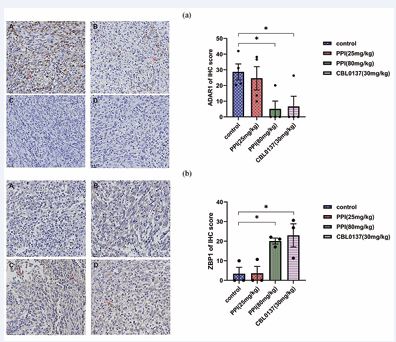 Figure 8 PPI inhibited ADAR1 protein expression and increased ZBP1 expression levels. Immunohistochemical detection of ADAR1 and ZBP1 protein expression levels in tumor tissues of mice in each groups (a, b). A: control group; B: Low-dose PPI group; C: High-dose PPI group; D: Positive control group (CBL0137). An asterisk (*) denotes a statistically significant difference between the control group and the drug-administered group (*: p<0.05).