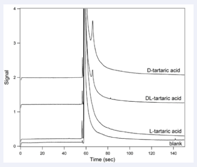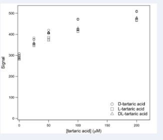 Determination of the D- and L-isomers of tartaric acid has been achieved after separation by capillary electrophoresis in the presence of a chiral selector and detection at 250 nm (Lumex Instruments, https://www.lumexinstruments.com/ files/DETERMINATION_OF_ORGANIC_ACIDS_ISOFORMS.pdf). Both isomers could be detected at concentrations as low as 300 µM with a 7 min separation time. A method for the measurement of L-tartaric acid based on the secondary activity of D-malate dehydrogenase and absorbance detection [2], has provided a detection limit of 20 µM. Recently, a fluorescent probe has been described that displays different colors in the presence of D- and L-tartaric acid [14].