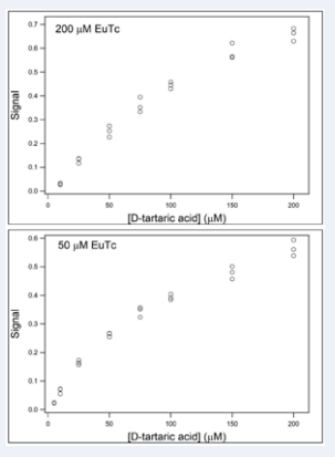 The relationship between signal and concentration, shown in the lower graph of Figure 3, has a curvature to it. This deviation from linearity was likely due to depletion of the Eu3+- tetracycline as the concentration of D-tartaric acid was increased. When the samples contained 200 µM Eu3+-tetracycline the curvature was reduced (Figure 3, upper graph).