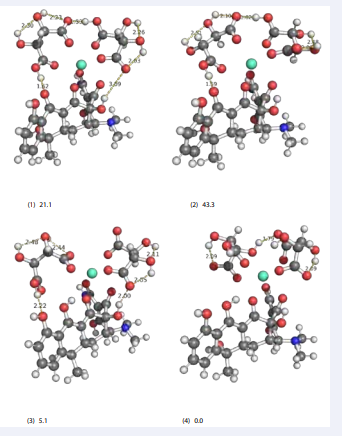 Figure 6: Molecular modelling derived structures of the europium-tetracycline complexes with tartaric acid. Structures of Eu3+-tetracycline-(tartarate)2 complexes determined with density functional theory and the SMD solvent model are shown. D-tararate structures are in the left column (1) and (3), and L-tartarate structures are on the right. (2) and (4). Hydrogen bonds are indicated with yellow dashes and distance given in Angstrom. Calculated relative free energies (kJmol-1) are shown adjacent to each structure label.