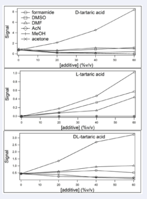 Although the presence of formamide increased the signal obtained for D-tartaric acid, this occurred at the expense of losing selectivity for the D-form over that of the L-form. This loss of selectivity also occurred in the presence of DMSO and DMF. Selectivity was maintained in the presence of acetonitrile, methanol and acetone but the signal was decreased by the presence of these additives.