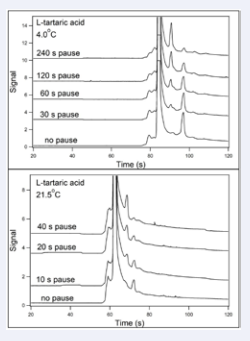 the resultant electropherograms for separations of the complex using L-tartaric acid performed at 21.5o C without a pause in the separation and with pauses of 10, 20 and 40 s (lower graph). As the pause period increased, the peak representing the Eu3+-tetracycline-tartaric acid complex decreased and a new peak, eluting at 68 s, increased. As the complex dissociated during the pause, Eu3+-tetracycline accumulated at the position in the capillary where the complex was sitting, which was partway along the length of the capillary. Upon resumption of the separation, this Eu3+-tetracycline produced the peak that appeared between that of the residual complex and the peak for the Eu3+-tetracycline that did not initially form the complex.