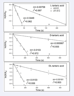 First order rate constants were determined graphically using plots of ln(peak height from paused separation/peak height from un-paused separation) versus time of the pause for all 3 isomers and at both temperatures. The rate constants at 21.5 and 4.0o C were used to determine the activation energy of dissociation of the complexes with the three different isomers of tartaric acid (Figure 9).