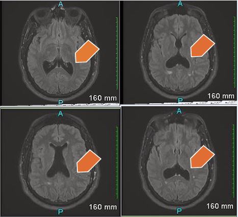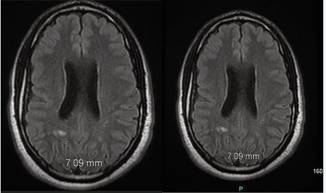 Brain MRI without contrast (Figure A), demonstrated a pattern of colpocephaly with cavum septum pellucidum and mild ventriculomegaly, as well as nonspecific foci of demyelination in the posterior periventricular white matter tracts, measuring up to 7 mm and more prominent on the right hemisphere as compared to the left hemisphere. No evidence of acute infarction, hemorrhage, or mass effect was observed. An EEG was performed to further evaluate for subclinical seizures and showed no epileptiform activity.