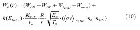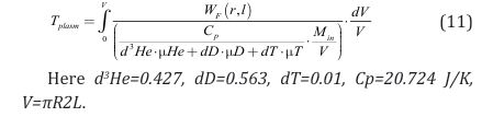 In the model it was considered that the process of mixture heating isobaric Figure 3, so the temperature and plasma density are inversely proportional. The starting pressure of the inlet mixture jet is 0.15 atm, density is 5·1018 cm-3. Mass flow rate of the input mixture Min=1.9·10 3 g/s (for helium-3 MinHe=1·10-3 g/s).The dimensions of the calculated plasma region in the longitudinal magnetic trap are radius R=0.2m, length L=2m. The reactions proceed with large energy release, neutrons are born again, and the process is closed by neutrons. The energy release in the plasma from the interaction of 3He, with thermal neutrons, with D and T, will be: