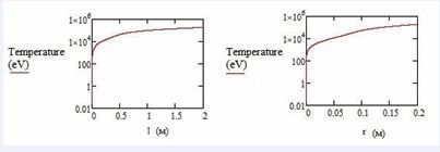 Here r is the distance from the axis; WDD + WDT + W3HeD - energy release from ions in hot plasma; k - Boltzmann constant; R - external radius of the plasma; vn = 2.2·103 m/s-thermal neutron velocity; KV/S ≈ V/S - volume integration factor of the flux - the ratio of the plasma volume to the area of its lateral surface 3n He v ≈ 1.19·10-24 cm-3/s, n3 He - concentration of 3He in the plasma. It is taken into account that the path length of thermal neutrons before interaction is larger than the transverse dimensions of the reactor, and that the density and concentration in the fuel composition fall with increasing temperature in the fuel composition.The reactor operation is sensitive to the mass flow rate of the fuel mixture. When the mass flow rate of the inlet mixture is reduced down to Min = 1. 10-4 g/s, the reactor size can be reduced and made more compact, but the plasma temperature drops. The increased T fraction is useful in the starting mode of reactor operation. In a fusion reactor, heating is carried out in 3He-n reactions, burnup is carried out mainly in D3He reactions, and energy removal is carried out through heat removal and energy conversion, or during expansion and acceleration of the injected fuel mixture in the rocket engine variant. The proposed reactor operates in the mode of a neutron helium plasma burner with a magnetic field, and is not a plasma containment device. Its purpose is localization, heating, acceleration of plasma and energy removal. The plasma temperature increase, with the introduction of the mixture and the neutron flux density obtained for catalytically closed regimes at a temperature of 15-20 keV were integrated Figure 4.