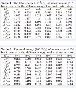 When we can calculate the total energy of axions on each excitation state, here energy level distribution are n = 1 to n = 6 and vortex quantum number distribution are l = 1 to l = 3, the calculation results are shown in Table 1 and Table 2. The unit of energy is 10-3 times of the moon mass