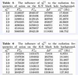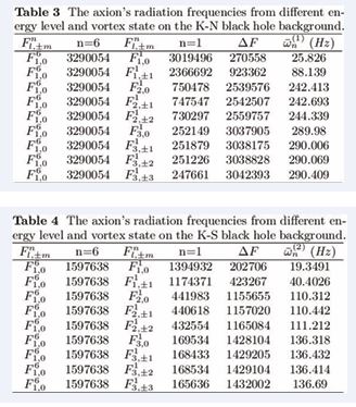 axion radiation frequencies from n = 6 to n = 1 are shown in Table 3 and Table 4. When η(i) is certain, we can see that the radiation frequencies in high vortex numbers are more than the radiation frequencies in low vortex numbers, the particle numbers around K-N black hole background are more than they around K-S black hole background. In addition, the axion’s radiation frequencies on the K-S black hole background are less than the axion’s radiation frequencies on the K-N black hole background.