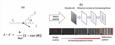 Figure 1 (a): An X-ray photon of wavelength λ comes in from the left, collides with an electron at rest, and a new photon of wavelength λ′ emerges at an angle θ. The electron recoils, carrying away an angle-dependent amount of the incident photon momentum [10]. (b): (top row) Sketch of a double-slit experiment with photons (DSE), conducted for increasingly longer periods of time. Photon impacts on the detector screen feature as black dots which turn into increasingly denser patterns of black dots as time proceeds. After development of the photographic plates, the individual “photon impacts” appear as small, permanently whitened spots, approximating “diffraction patterns” in the long run [11].