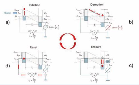 The principle architecture of a PID is shown in (Figure 2), in the form of a semiconductor-like band diagram, featuring two metal or semiconductor electrodes positioned face-to-face to each other in the form of a parallel-plate capacitor, with both electrodes having an electron work function of whichissmallerthan the energy Eph of thephotonstobedetected.Thefour subfigures in Figure 2 show how a photon, entering from the left, generates a photoelectron that is able to move from photocathode to photoanode through an electrode gap of width L, thusgeneratingadisplacement current Is (t) which is macroscopically observable outside the device and which indicates that a photon had arrived at the spacetime location