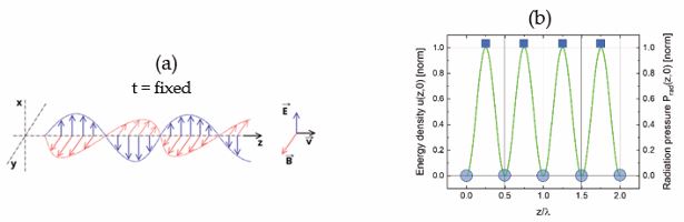 The transport of electromagnetic field energy through space is described by Poynting´s theorem [36,37], which yields for the electromagnetic energy density. This variation is plotted in Figure 5b. As u (z , t) varies quadratically with the electrical and magnetic field strengths, positive pulses of electromagnetic energy are repeatedly, but discontinuously being shifted along the positive z -axis with afinite step length of . Further considering that the dimension of u (z , t) of Nm⁄m3 = N⁄m3=pa matches the dimension of pressure, Equation 11 also describes the variation of the radiation pressure prad (z ,t) that is produced by a travelling electromagnetic plane wave.