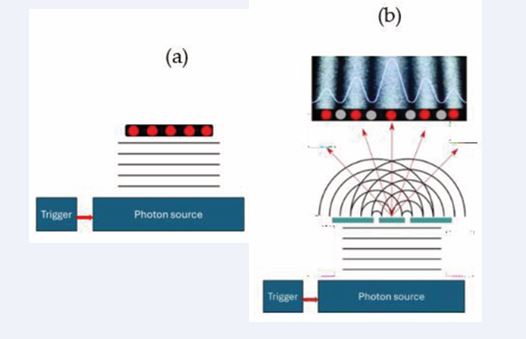 Figure 6 (a): Coherent light source launching plane electromagnetic waves towards a flat-plate absorber fitted with an array of photon detectors (red circles); (b) same kind of photon source launching plane electromagnetic waves towards an absorber pierced with two transparent slits. The ensuing emission of diffracted wave trains form an arrival pattern of photons on a downstream photographic screen. Colored circles indicate possible detector positions for tracing plane-wave propagation in (a) and non-uniform diffraction pattens of EOs in (b).
