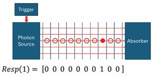 (Figure A1). A photon source, producing plane-wave fronts carrying photons, moving on parallel paths, from source to sink. Along the chosen line, a 10-detector array is positioned at regular positions with identical distances between detectors to allow photons to be detected as they move from source to sink. In the example above, a single photon travelling through the array is randomly absorbed at the eighth detector downstream to the source, thereby producing as an output signal a 10-element response vector with ZEROs at all positions, except for position 8.
