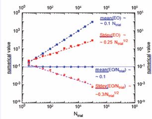 Figure A2 :(a) top curves: Numbers of accumulated EOs and their standard deviation with increasing numbers of photon passages Ntrial through the array; (b) same quantities as above but normalized to the numbers of photon passages Ntrial through the array.