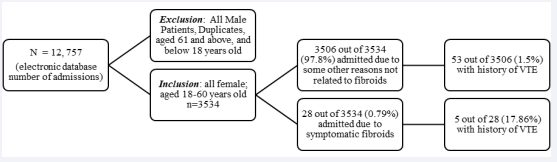 A total of 12,757 admissions were recorded in the electronic database of Imam Abdulrahman Al Faisal Hospital from January 2023 to May 2024. Male patients, duplicate records, and patients younger than 18 or older than 60 were excluded (N=9,223). The study included all female patients between the ages of 18 and 60 (N=3,534). Out of 3534 admitted female patients who met the inclusion criteria, 3506 (97.8%) were being admitted due to some other reasons and treated for non-fibroid related problems. Of those patients, 53 (1.5%) had a prior history of VTE and one of the 53 developed hospitalacquired pulmonary embolism. Additionally, 28 patients (0.79%) were admitted with symptomatic uterine fibroids and required further management, including surgical intervention. Among them, 5 (17.86%) had a history of VTE; four were receiving therapeutic doses of anticoagulants, and one has a history of hospital-acquired VTE. Table 1 presents a descriptive analysis of the 3,534 valid cases for all the variables studied.
