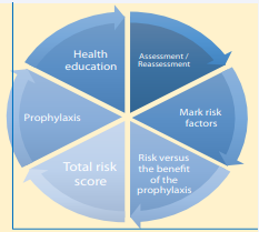 After marking the risk factors, the next step includes assessing the risk versus the benefit of prophylaxis in patients. In this step, contraindications and warnings/ precautions should be evaluated, and if the patient has any of the contraindications, mechanical prophylaxis should be considered, such as the sequential compression device (SCD), properly fitted graduated elastic compression stockings (ECS), and electric stimulation device.