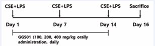 After mixing 1 mg/mL of CSE and 100 μg/mL of LPS in a 1:1 ratio, 50 μL of the mixture was aspirated into the 7-week-old C57BL/6 male mice once a week for a total of three weeks to induce COPD. The mice were anesthetized using intraperitoneal injection of 7% chloral hydrate (C8383, Sigma), and the mixture of CSE and LPS was administered through the airways. The mice were divided into experimental groups as follows: normal group (n=8), no treatment; control group (n=8), treated with a mixture of CSE and LPS; positive control group (Dexa, n=8), orally administered 3 mg/kg of dexamethasone following treatment with the mixture of CSE and LPS; GGS01-treated groups (100, 200, and 400 mg/kg, n=8 per group), orally administered GGS01 following treatment with the mixture of CSE and LPS. The drugs were administered orally daily for two weeks (Figure 1).