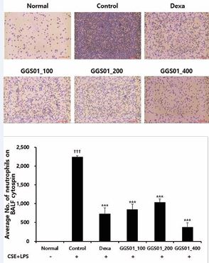 Figure 2 Effect of gamchogeongang-tang (GGS01) on (A) cytospin image of neutrophils and (B) absolute number of neutrophils in the bronchoalveolar lavage fluid (BALF) of chronic obstructive pulmonary disease mice. Mice were exposed to cigarette smoke extract (CSE) + lipopolysaccharide (LPS) (control) via aspiration and then treated with dexamethasone (Dexa, 3 mg/kg) and GGS01 (100, 200, or 400 mg/kg) for 21 days (n = 4). Data are shown as mean ± SEM. †††p < 0.001, ***p < 0.001.