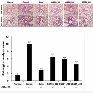 Figure 5: Effect of gamchogeongang-tang (GGS01) on histopathological changes in the lung of cigarette smoke extract (CSE) + lipopolysaccharide (LPS) induced chronic obstructive pulmonary disease mice model. Mice were exposed to CSE+LPS (control) via aspiration and then treated with dexamethasone (Dexa, 3 mg/kg) and GGS01 (100, 200, or 400 mg/kg) for 21 days (n=4). (A) Representative sections of the lung stained with H&E stain and M-T stain (light microscope at 100× magnification). (B) Quantitative evaluation of the degree of lung tissue damage in the paraffin sections. Data are shown as mean ± SEM. ††† p<0.001, *** p<0.001.