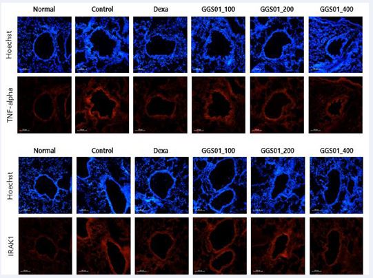 Figure 6; Effects of gamchogeongang-tang (GGS01) visualized using immunohistofluorescence (IHF) staining (TNF-α and IRAK1) in the lung tissue of cigarette smoke extract (CSE) + lipopolysaccharide (LPS)-induced chronic obstructive pulmonary disease mice model.