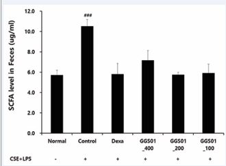 The effects of GGS01 on short-chain fatty acids in the lung tissues of the COPD animal model in the small intestine production were compared (Figure 7). In the control group, compared with the normal group, the level of short-chain fatty acids in the contents of the small intestine was increased. The shortening of the contents of the small intestine fatty acid was not significantly different between the experimental groups.