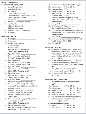 Data was collected by midwives who were recruited from the hospital and trained. Face to face interviews using the pre-tested questionnaire was used to collect information on demographic characteristics, family history of hypertension and diabetes, dietary habit and history of pre-term deliveries. Data on Blood pressure, haemoglobin levels and blood glucose were extracted from the maternal health record book.