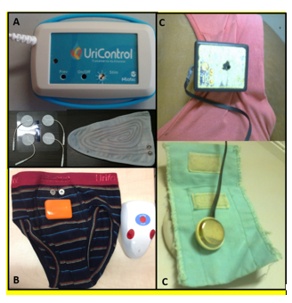 Figure 1: (A) –[Alarm with electrical muscle stimulation], (B) –[Wireless sound alarm with sensor in underwear] , (C) –[Wired sound alarm]