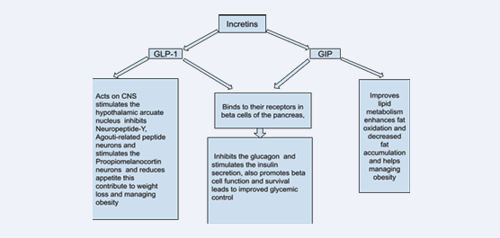 It is widely accepted that incretins play a role in regulation of appetite and satiety via many targets. When used, GLP-1 enhances satiety and significantly suppresses appetite, which in one way or the other reduces food consumption. It was also previously found that incretins have effects on the vagus nerve of CNS and slow down the emptying in gastric chambers along with the onset of the feeling of satiety. In addition to effects on adipocyte development, viability, and differentiation, GIP may also facilitate a reduction in body weight and healthy expansion of white adipose tissue thereby decreasing development of ectopic fat stores which helps improve insulin sensitivity [9] (Figure 1).
