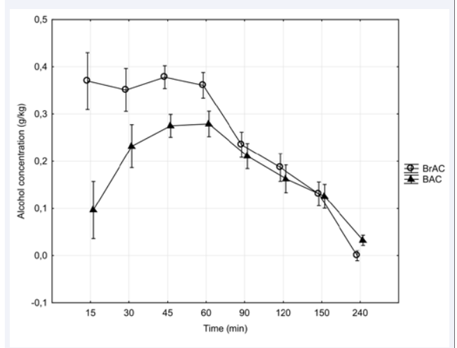 For each volunteer BrAC and BAC measurements were obtained and average values were plotted on the figure (Figure 1). Average maximum values of BAC after consuming red wine were 0.28 g/kg respectively while BrAC values were 0.41 g/kg.