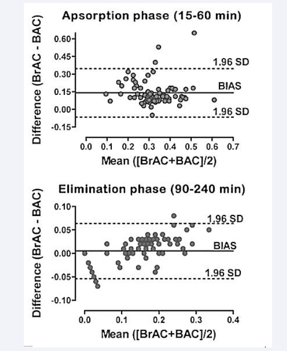 In the absorption phase the mean bias (BrAC-BAC) was 0.141 ± 0.105 g/kg and the 95% limits of agreement from -0.065 to 0.346 g/kg. However, in the elimination phase the mean bias (BrACBAC) was 0.005 ± 0.030 g/kg and the 95% limits of agreement from -0.054 to 0.065 g/kg by Bland - Altman plot (Figure 2).