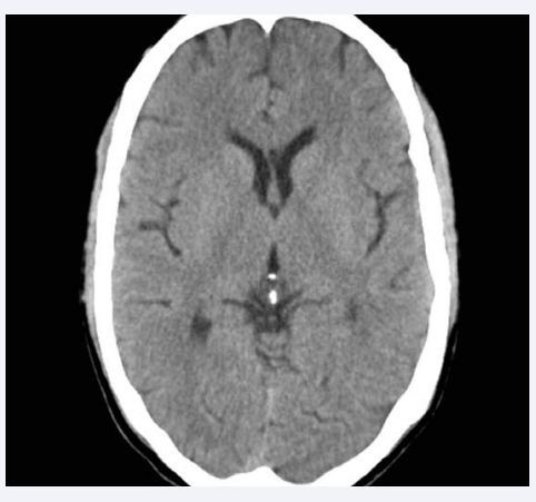 Figure 2: C. T. scan of an alcohol dependent patient showing abnormal CSP (Length 9.6mm, Width 4.7mm, Width of septum 1.2mm)
