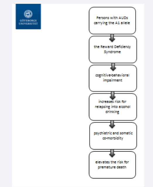 Taking the idea of RDS as starting point, a model for relapse proneness has recently been suggested by Balldin and colleagues [17]. The model is composed of studies that independently of each other have found a strong relationship between the A1 allele and AUDs. The model outlines why some individuals are more prone to continue relapsing, despite having received a standard psychosocial and/or pharmacological treatment for AUDs. It also outlines what the consequences will be if relapse is not prevented. The model is as follows: